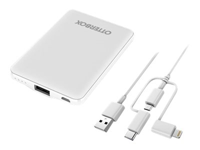 Description du produit OtterBox Standard Mobile Charging Kit banque d'alimentation - USB - 10.5 Watt Type de Produit Banque d'alimentation Dimensions (LxPxH) 6.31 cm x 9.25 cm x 1.26 cm Poids 120 g Couleur Blanc Type de prise USB - sur le câble : Lightning/Micro-USB/USB-C Tension requise 5 V Tension fournie 5 V Courant électrique max. 2.1 A Technologie de charge rapide Apple Fast Charge, Samsung Adaptive Fast Charging Batterie 5000 mAh Alimentation fournie 10.5 Watt Câbles Micro-USB/USB-C/câble Lightning vers câble USB - 1 m Garantie du fabricant Garantie limitée à vie -