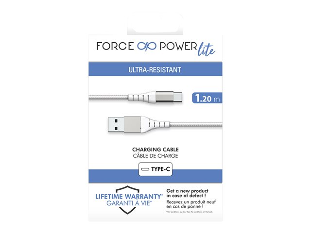 Description du produit Force Power - Câble USB de type-C - USB pour 24 pin USB-C - 1.2 m Type Câble USB de type-C Fonctions Synchronisation et charge, tressé Longueur 1.2 m Connecteur USB de type A 4 broches - mâle Connecteur (deuxième extrémité) 24 pin USB-C - mâle Courant nominal 3 A Couleur Blanc Garantie du fabricant Garantie limitée à vie -