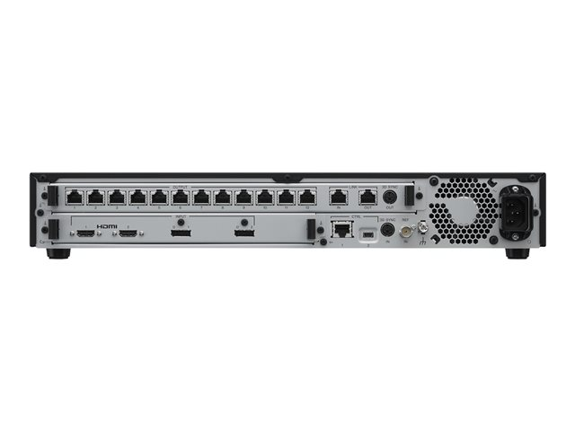 L'unité de montage sur bâti de taille 1,5 U est dotée de 12 ports de sortie RJ45, de 2 entrées vidéo HDMI et 2 entrées DisplayPort, de la synchronisation 3D, de la fonction Genlock, de ports de contrôle et de maintenance réseau ainsi que de ports d'entrée/sortie de liaison pour l'interconnexion avec d'autres contrôleurs d'affichage ZRCT-300 afin de créer des écrans encore plus grands.