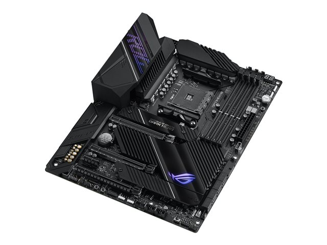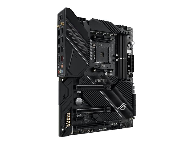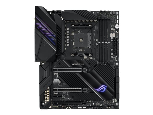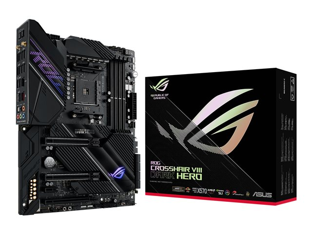 ROG Crosshair VIII Dark Hero est une carte mère de gaming ATX AMD X570 avec PCIe 4.0, 16 étages de puissance, OptiMem III, Wi-Fi 6 intégré (802.11ax), LAN de 2,5 Gbit/s, USB 3.2, SATA, M.2 et éclairage Aura Sync RGB.