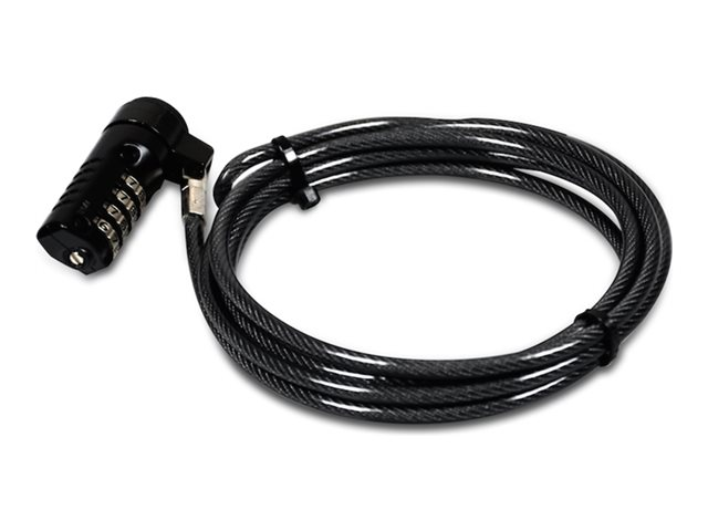 Câble de sécurité pour ordinateurs portables, de bureau, écrans, retro projecteurs et périphériques munis d'une encoche de sécurité. Le câble possède un code à 4 chiffres dont la combinaison peut être personnalisée (Jusqu'à 10 000 combinaisons possibles).