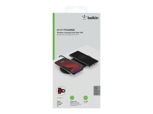 Description du produit Belkin BOOST CHARGE Dual plot de charge sans fil - + adaptateur secteur - 15 Watt Description du produit Belkin BOOST CHARGE Dual plot de charge sans fil - + adaptateur secteur - 15 Watt Type de Produit Plot de charge sans fil + adaptateur secteur Type de Produit Plot de charge sans fil + adaptateur secteur Couleur Noir Couleur Noir Normes de recharge sans fil Qi Normes de recharge sans fil Qi Alimentation fournie 15 Watt Alimentation fournie 15 Watt Garantie du fabricant Garantie de 2 ans Garantie du fabricant Garantie de 2 ans Conçu pour Apple iPhone 11, 11 Pro, 11 Pro Max, 8, 8 Plus, X, XR, XS, XS Max; Samsung Galaxy Note10, Note10+, S10, S10+, S10e Conçu pour Apple iPhone 11, 11 Pro, 11 Pro Max, 8, 8 Plus, X, XR, XS, XS Max; Samsung Galaxy Note10, Note10+, S10, S10+, S10e -
