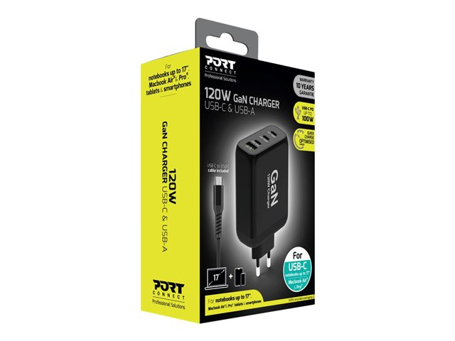technologie GaN - 120 Watt - 5 A - PD, QC 3.0 - 4 connecteurs de sortie (USB type A, 3 x USB-C) - Europe