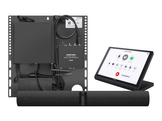 Le système de conférence de table UC-B31-Z Crestron Flex offre une solution de vidéoconférence pour les petites salles, à utiliser avec le logiciel Zoom Rooms. Il prend en charge jusqu'à trois écrans vidéo et comprend un écran tactile de table, une barre vidéo Jabra PanaCast 50, un support UC, un injecteur PoE et des câbles.