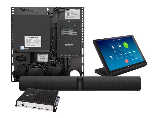Le système de conférence de table avancé Crestron Flex UC-BX31-Z offre une solution de vidéoconférence pour les petites salles, à utiliser avec le logiciel Zoom Rooms. Il prend en charge jusqu'à trois écrans vidéo et comprend un écran tactile de table, une barre vidéo Jabra PanaCast 50, un ensemble de supports UC, un émetteur de présentation UC, un injecteur PoE et des câbles.