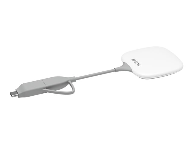 Tout est simple : branchez l'émetteur sans fil sur l'ordinateur portable et cliquez sur l'application intégrée pour commencer à transmettre le contenu à l'écran. Les utilisateurs d'appareils mobiles peuvent également se connecter à l'aide du protocole Miracast ou de l'application gratuite iProjection d'Epson.