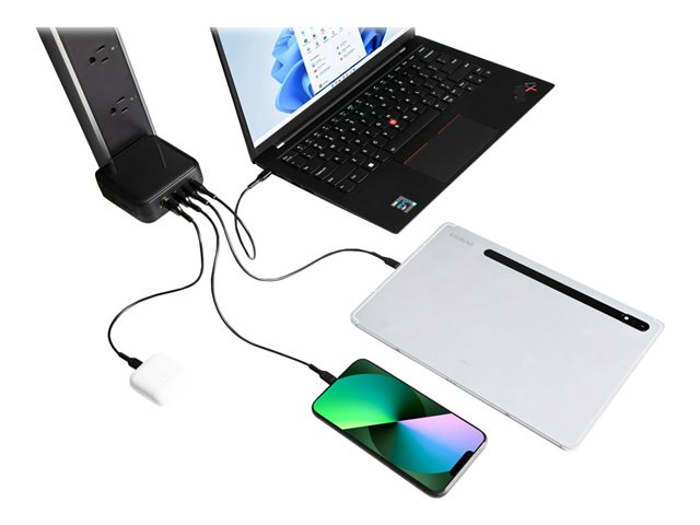 Avec le chargeur mural GaN 100 W de Targus, vous bénéficiez d'une puissance élevée qui dure plus longtemps que les chargeurs traditionnels. Alimenté par la technologie GaN efficace, ce chargeur est puissant avec 4 ports - 2 USB-C (avec un port unique pouvant utiliser jusqu'à 100 W) et 2 USB-A avec des capacités de charge rapide prenant en charge jusqu'à 18 W - afin que vous puissiez charger votre ordinateur portable professionnel, votre ordinateur portable personnel, votre téléphone et votre tablette en même temps. La charge GaN est plus efficace dans le transfert d'énergie, elle consomme donc moins d'énergie et disperse moins de chaleur pendant son fonctionnement. Cela signifie une charge plus froide et plus sûre pour vous. Comme tous les produits Targus, ce chargeur répond à des normes strictes de qualité et de sécurité et satisfait aux exigences UL.
