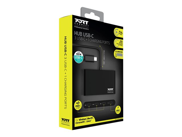 Le hub USB-C 900147 de PORT Connect permet de convertir un port USB-C de votre ordinateur en 4 ports USB-C. Connectez vos périphériques (souris, clavier, webcam, ...) et profitez d'un transfert de données ultra rapide grâce à ses 3 connexions USB-C 3.1 Gen1. Chargez votre ordinateur jusqu'à 100W via son port USB-C Power Delivery . Son câble de 30 cm de long garantit une grande maniabilité. Parfaitement adapté à la mobilité, vous pouvez l'emmener partout grâce à son design de voyage et sa fonction d'auto-alimentation. Compatible avec Windows, Mac OS, Chrome OS et Linux, il suffit de le connecter via USB-C à votre ordinateur pour commencer à l'utiliser.